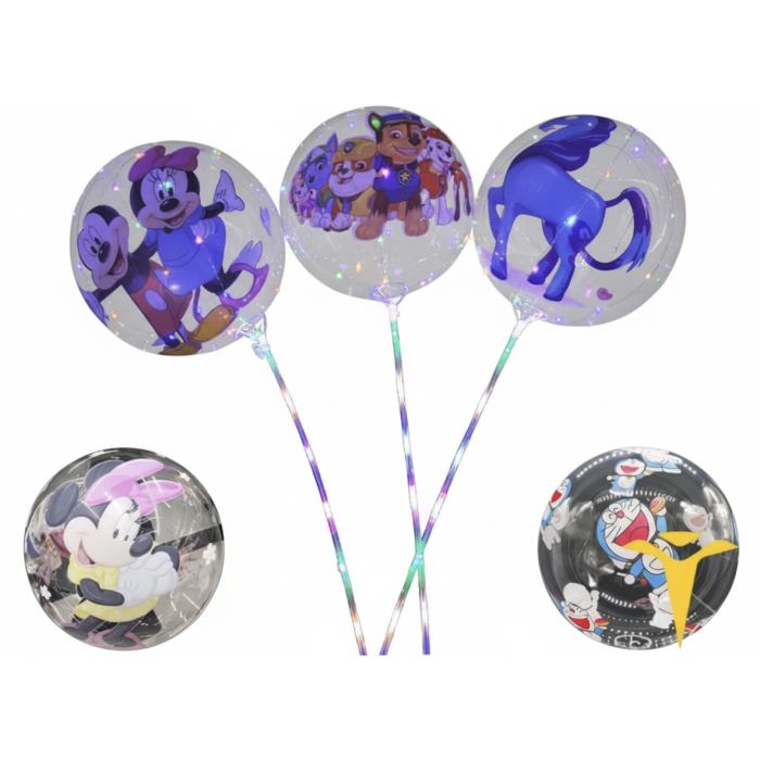 Baloane transparente cu LED și personaje populare – un decor spectaculos pentru petreceri de copii sau evenimente speciale. Fiecare balon include lumini colorate strălucitoare și imprimeuri cu figuri îndrăgite precum Minnie Mouse, Paw Patrol, My Little Pony și Doraemon. Perfecte pentru decoruri foto, aniversări sau cadouri originale. Disponibile acum cu fundal alb curat, pentru un aspect elegant și profesional în fotografii.