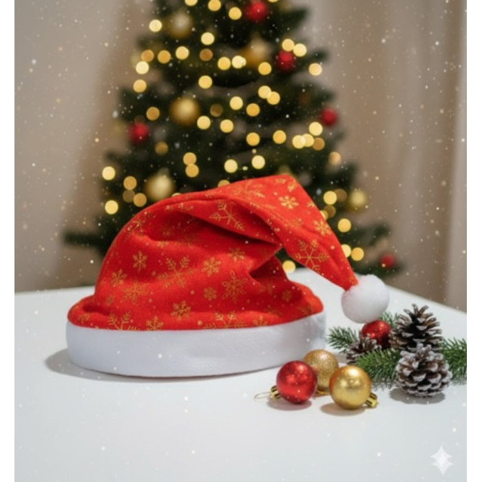 Caciula elegantă și festivă de Moș Crăciun cu fulgi aurii, ideală pentru a completa ținuta de sărbătoare și a intra în spiritul Crăciunului. Marg..