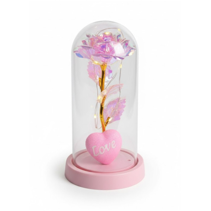 Aranjament floare trandafir  artificial cu aspect metalizat, tulpină aurie.cu led in recipient plastic 25cm. Acest aranjament de poveste surprinde esența romantismului sub o cupolă de sticlă cristalină. În centru,se afla un trandafir cu inimioara, simbol al iubirii care nu se ofilește niciodată.
