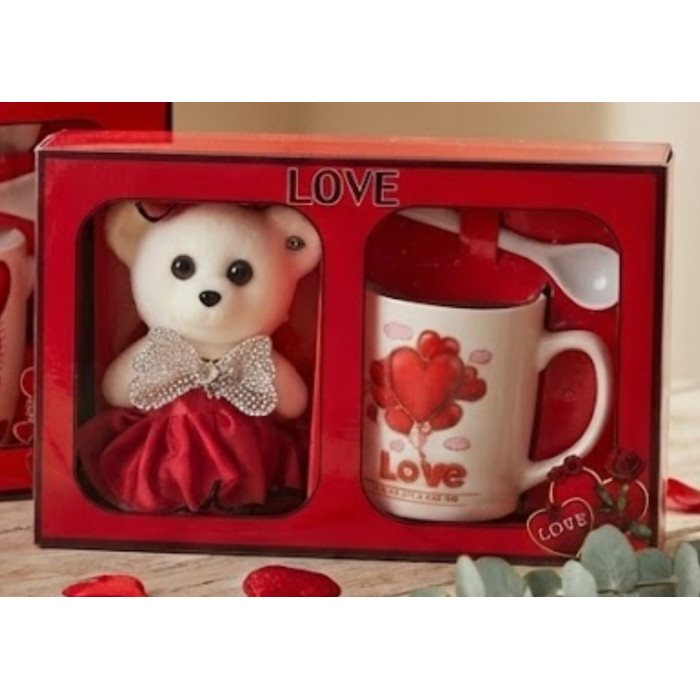 Set cadou romantic Valentine's Day – ursuleț de pluș și cană ceramică "Love" cu Lingurița include o cana ceramica 300ml cu lingurita si farfurioara din ceramica si un ursulet din plus 20cm