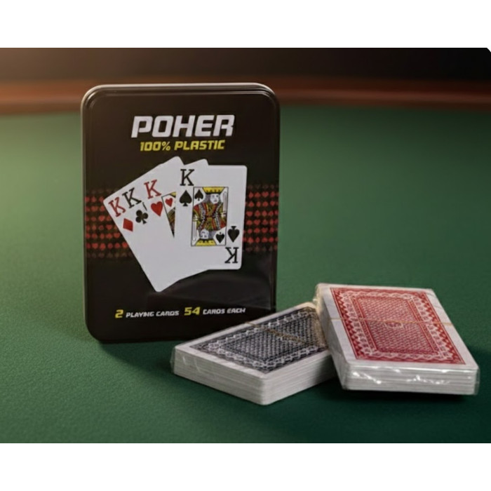 Set de 2 pachete carti joc poker plastic in cutie metalica. Cărți de joc profesionale: Jucătorii de poker preferă varianta din plastic pentru că "alunecă" mai bine la amestecat și distribuire, sunt mult mai durabile decât cele din carton, sunt lavabile și nu se îndoaie ușor.