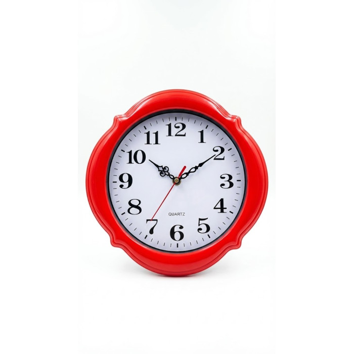 Ceas de perete 25cm îmbină funcționalitatea cu un design plăcut, fiind accesoriul perfect pentru a completa decorul oricărei încăperi. Rama sa roșie, cu un contur ușor ondulat, oferă un aspect retro-modern care atrage privirea, fără a fi strident.