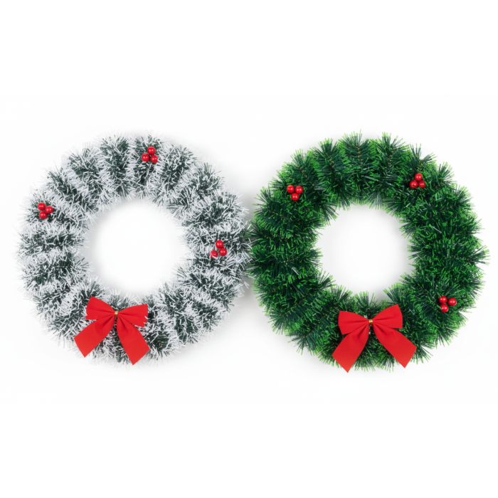 Coronite decorative cu diametru 30 cm cu fundita si bobite rosii confecționate din material plastic de înaltă densitate, ramurile sunt pline și rezistente, imitând fidel ramurile naturale de brad. Ghirlandă plină cu ramuri verzi, realist, ideală pentru a fi personalizată cu lumini sau panglici proprii.