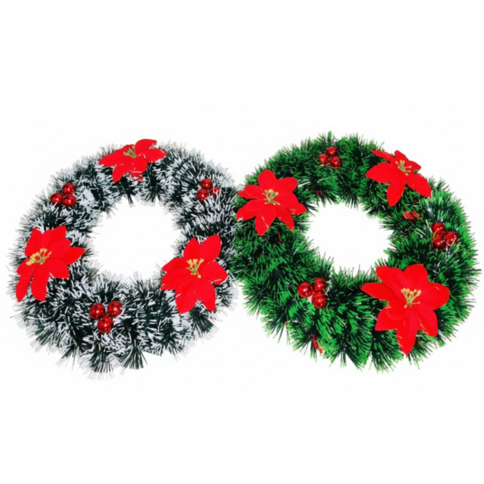Coronite decorative cu diametru 30 cm cu flori craciunite, fundita si scris metalic confecționate din material plastic de înaltă densitate, ramurile sunt pline și rezistente, imitând fidel ramurile naturale de brad. Ghirlandă plină cu ramuri verzi, realist, ideală pentru a fi personalizată cu lumini sau panglici proprii.