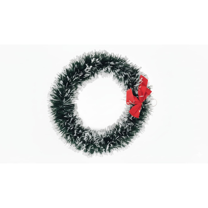 Coronita decorativa Craciun 30 cm cu fundita rosiie Realizată dintr-o ghirlandă densă, cu aspect de ramuri de brad, este decorată cu o fundita rosie care adauga un contrast clasic si festiv.
