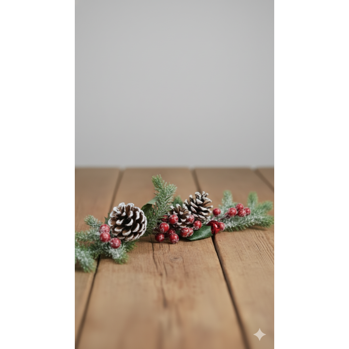 Crenguta brad cu conuri, globuri si bobite si zapada 70cm. Inspirat de estetica peisajelor de iarna, produsul combină elemente naturale – crenguța de brad, conurile și bobițele roșii – finisate cu un strat subtil de zăpadă artificială, rezultând într-o compoziție vizuală armonioasă și tradițională.