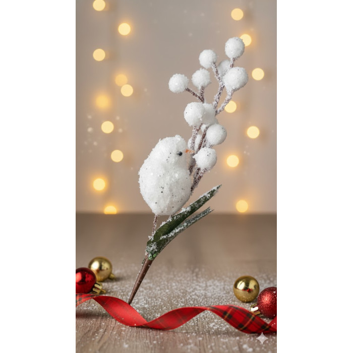 Crenguta decorativa cu pasare si bobite albe 30cm. Ornamentul înfățișează o pasăre albă așezată pe o crenguță cu bobițe, evocând o scenă poetică de iarnă.