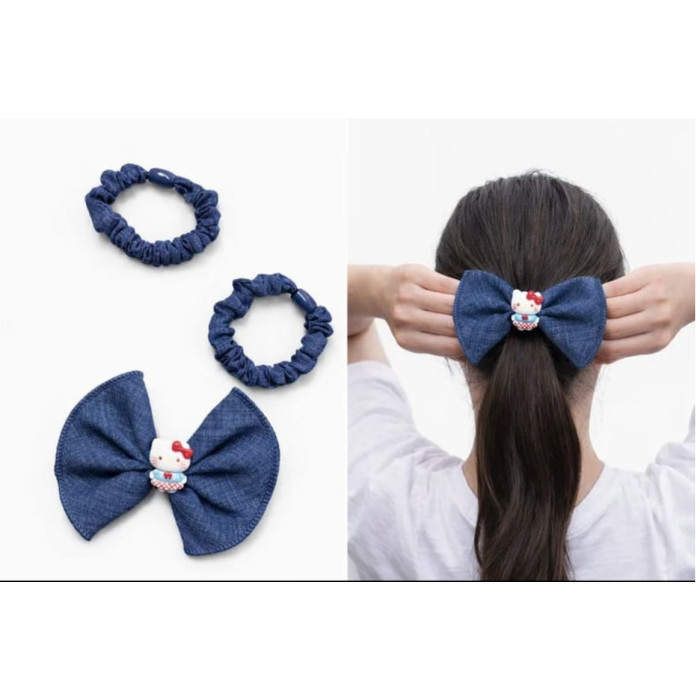 Set accesoriu cu 3 piese pentru păr din denim, format din două elastice și o fundiță mare decorată cu un personaj îndrăgit de copii. Materialul tip je..