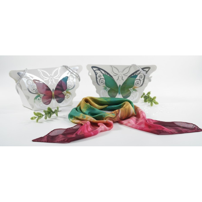 Tags: eșarfă mătase, cutie cadou fluture, accesorii damă, cadou mărțișor, eșarfă colorată, ambalaj lux argintiu.