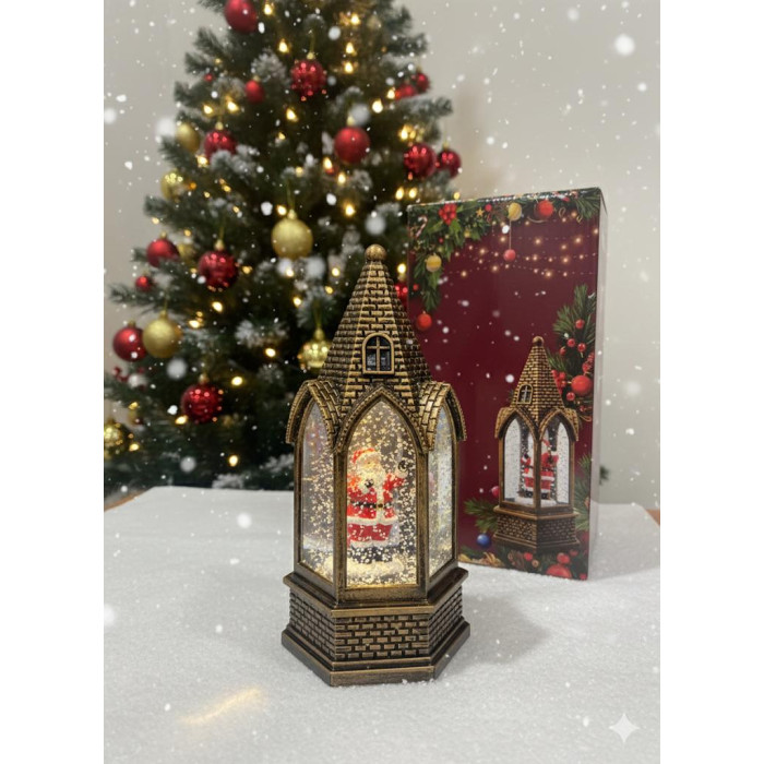 Felinar muzical Craciun, glob de zapada cu Mos Craciun cu cablu USB sau 3 bateriiR6 iluminează scena interioară cu o lumină caldă, punând în evidență silueta lui Moș Crăciun si reda melodii clasice de Crăciun, sporind farmecul sărbătorilor.Felinarul este modelat într-un stil arhitectural elegant, similar unei mici biserici sau structuri gotice, de culoare auriu-bronz antic. Detaliile de cărămidă și ferestrele laterale contribuie la aspectul său deosebit. În interior, este vizibilă o figurină a lui Moș Crăciun în costumul său roșu.