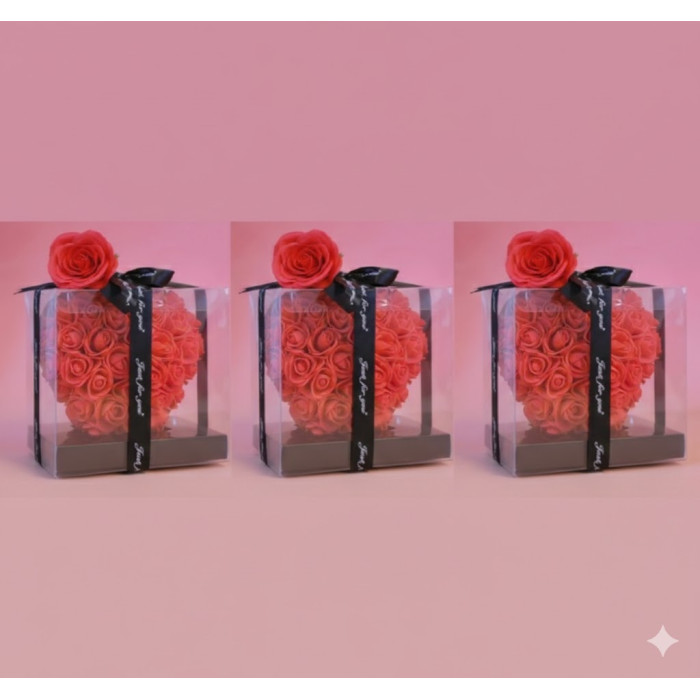 Aranjament floral inima din trandafiri rosii sapun in cutie de plastic transparenta 20cm. Inima este formată din zeci de trandafiri roșii, finisa..