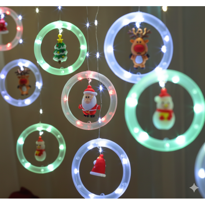 Instalatie perdea luminoasa Craciun cu 110 leduri color, 3.5m lungimesi 10 globulete care contin figurine cu Mos Craciun si sunt iluminate de o lumina vesela, vibranta color.