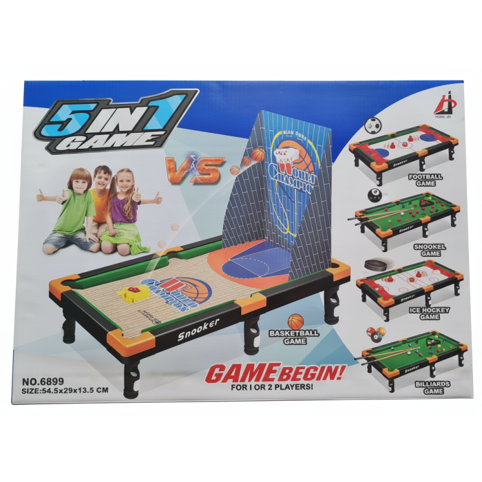 Masă de joc 5 în 1 pentru copii – fotbal, baschet, biliard, snooker și hochei. Descoperă masa de joc 5 în 1 pentru copii, un set interactiv și distractiv care include jocuri populare: fotbal, baschet, biliard, snooker și hochei pe aer. Ideală pentru 1 sau 2 jucători, această masă multifuncțională stimulează coordonarea, competiția sănătoasă și spiritul de echipă. Fabricată din materiale rezistente, este perfectă pentru uz casnic sau cadou pentru copii pasionați de sport și joacă activă. Dimensiuni: 54,5 x 29 x 13,5 cm.