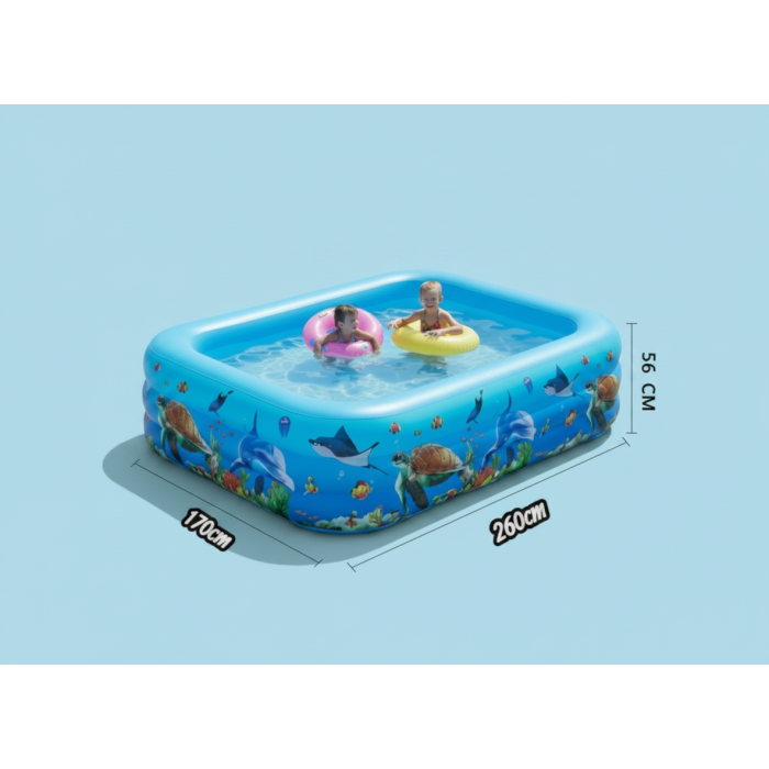 Piscina gonflabila dreptunghiulara, albastra cu dimensiunea 260x170x56cm adancime. Piscina dreptunghiulara are o constructie a peretilor din 3 inele gonflabile si o supapa de scurgere rapida a apei.