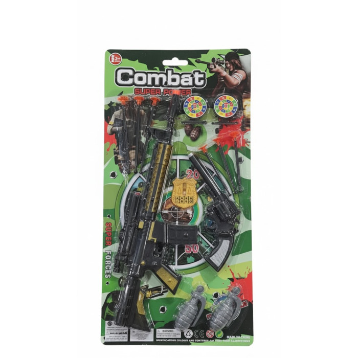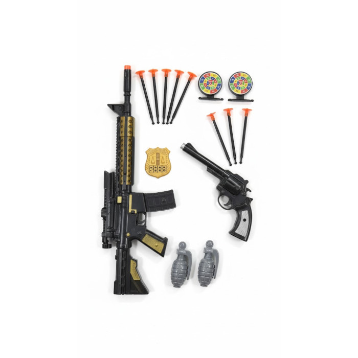 Set jucarie cu o pușcă de asalt mare (aprox. 57 cm) și un revolver de mână, plus accesorii suplimentare, setul este ideal pentru a dezvolta precizia și coordonarea ochi-mână în jocuri de tip forțe speciale sau poliție.