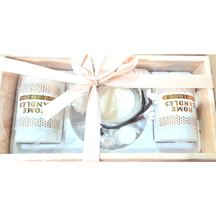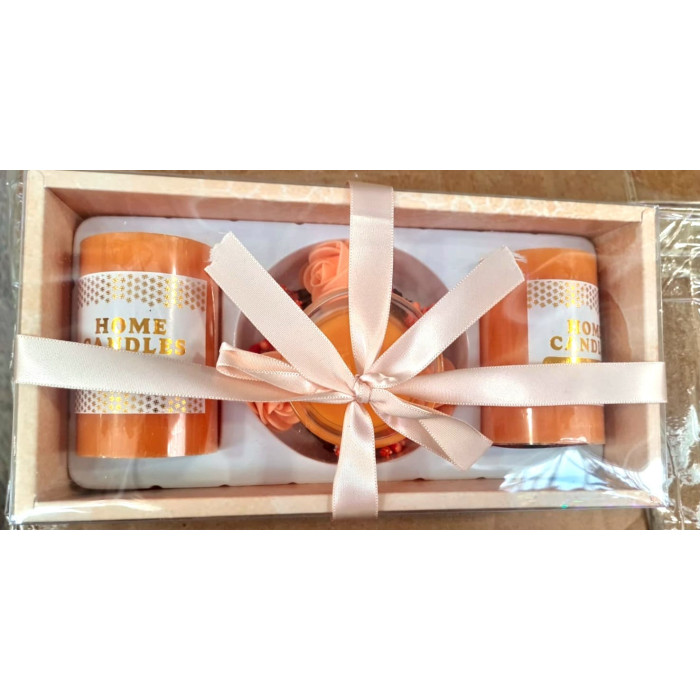 Set elegant de lumânări decorative, ambalat într-o cutie transparentă, cu două lumânări tip stâlp (mari), o lumânare mică în recipient de sticlă și decorațiuni florale. Setul este finisat cu o fundă decorativă din satin, care îl face gata de oferit cadou.
