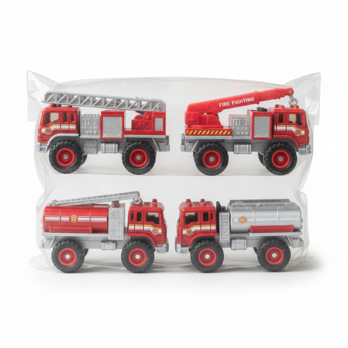 Set de vehicule de pompieri cu 4 masinute diferite, fiecare avand 12cm.