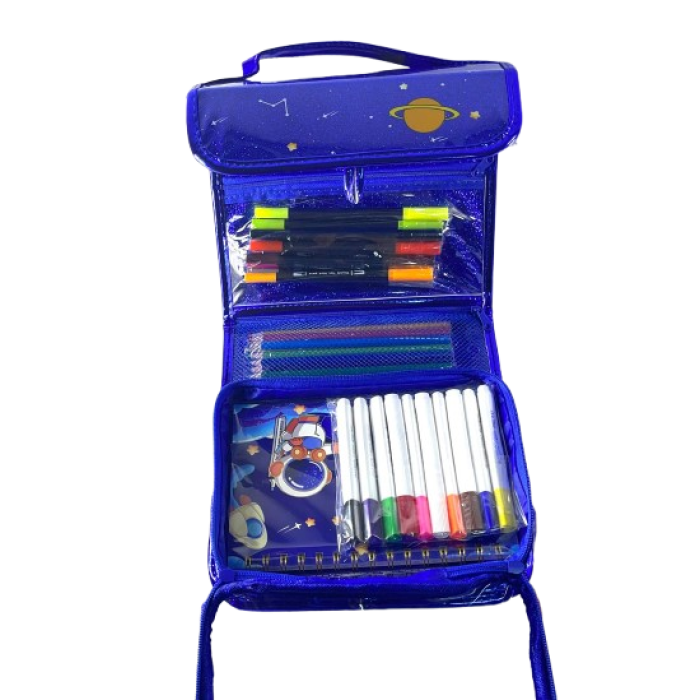 Gentuta de calitate cu diferite accesorii pentru desen si pictura: creioane colorate, carioca, creioane cerate, acuarele, pensula, rigla, radiera...